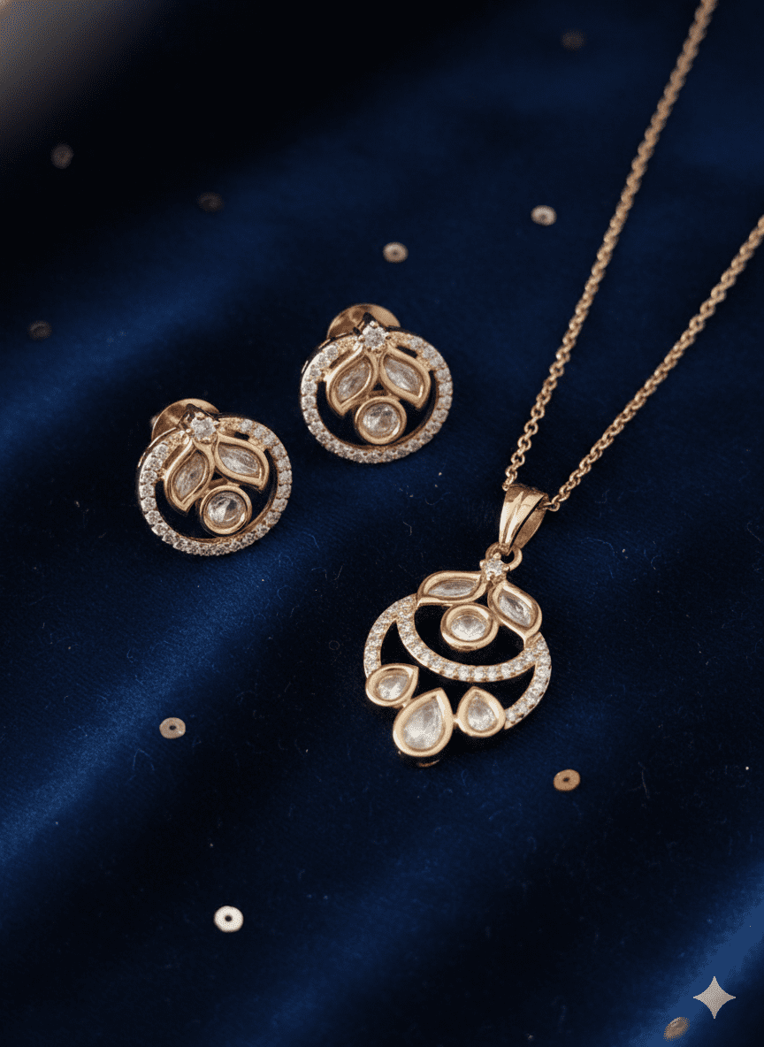 Add a touch of timeless elegance to your look with this beautifully crafted Moissanite pendant set. Designed with sparkling moissanite stones and a graceful gold-tone finish, the pendant features delicate teardrop and round stone detailing that creates a luxurious and radiant appeal. Paired with matching stud earrings, this set is perfect for both everyday elegance and special occasions. Lightweight, stylish, and effortlessly chic, it enhances any outfit with a subtle yet sophisticated sparkle. ✨